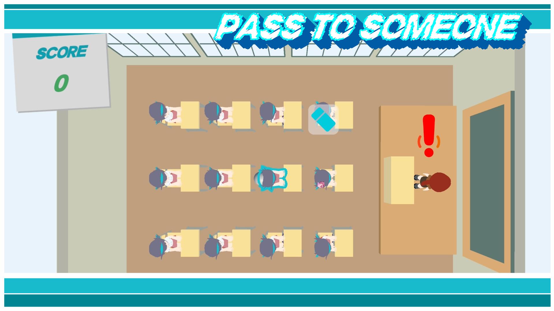 Kamu bermain sebagai siswa-siswi di sekolah SD. Ujian tengah berlangsung, guru menulis soal di papan tulis dan beberapa dari siswa-siswi tersebut tidak membawa barang yang dibutuhkan. Kamu perlu mengoper barang-barang tersebut secara strategis kepada mereka yang membutuhkan tanpa ketahuan oleh si guru.